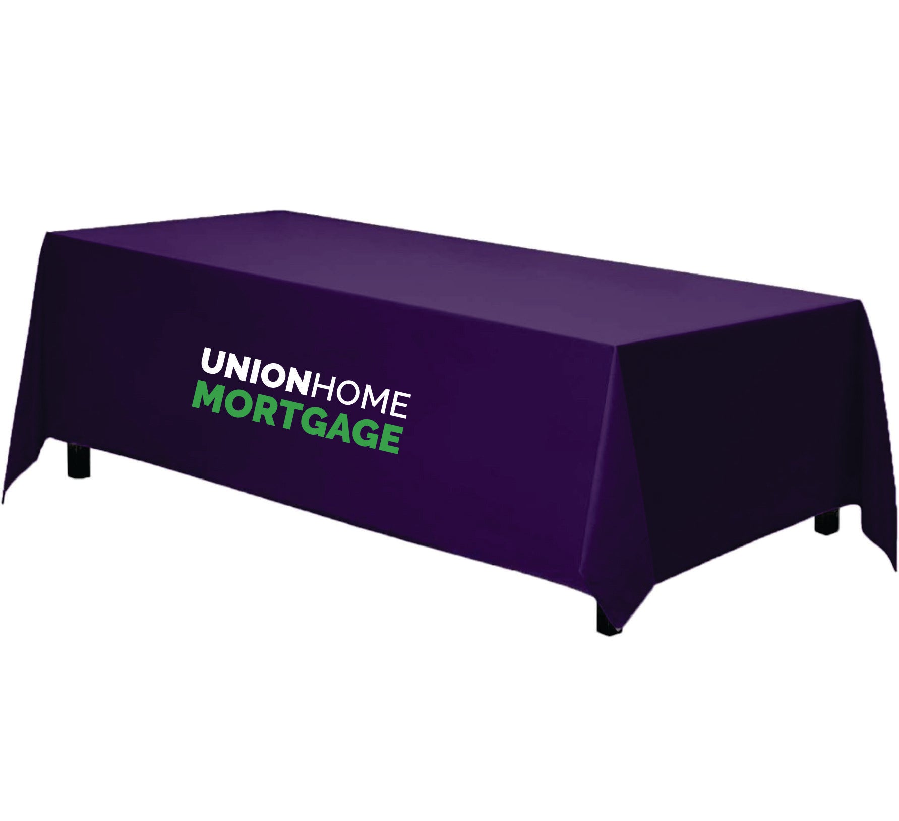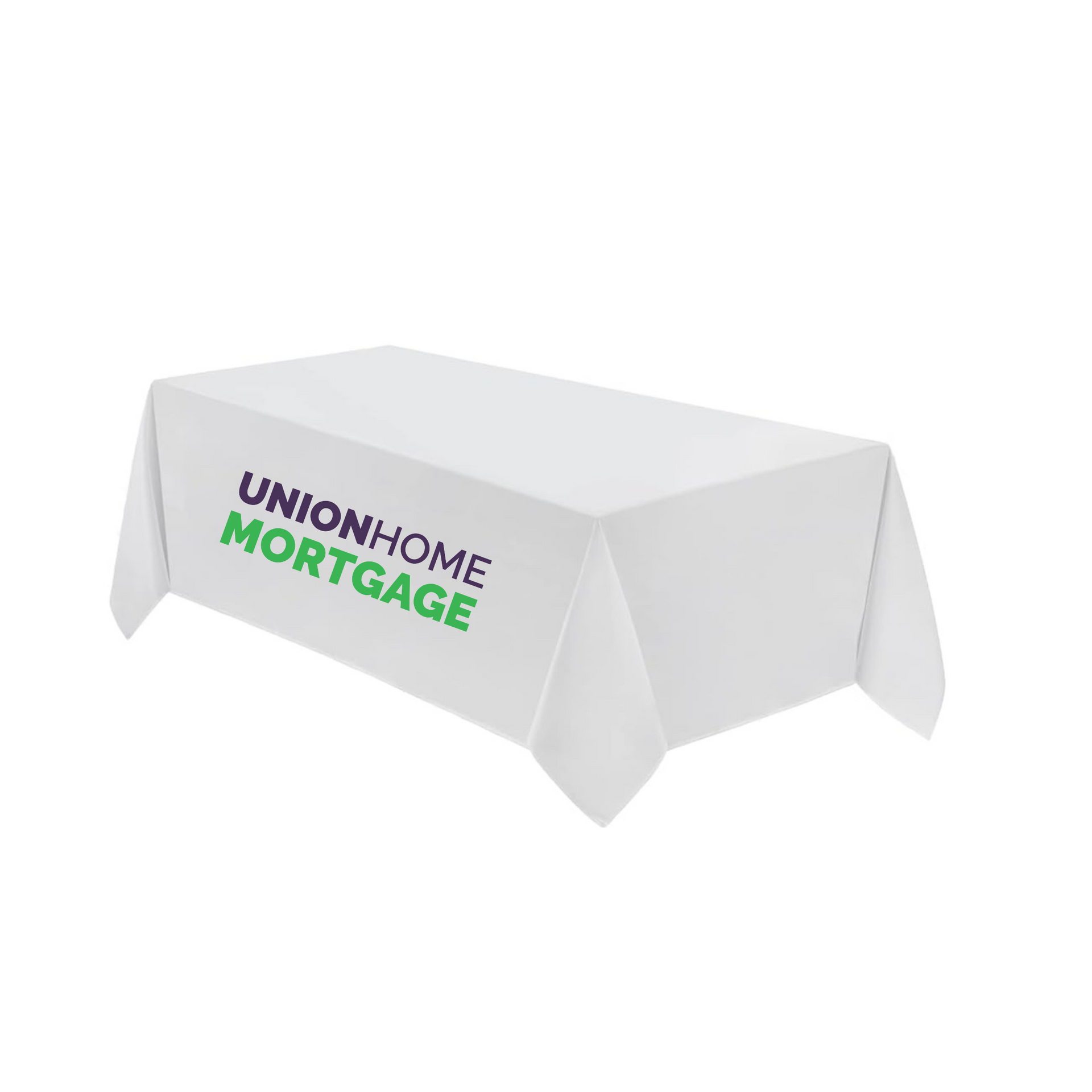 Show who you are with this logoed 8 ft tablecloth. 100% polyester and machine washable and reusable.