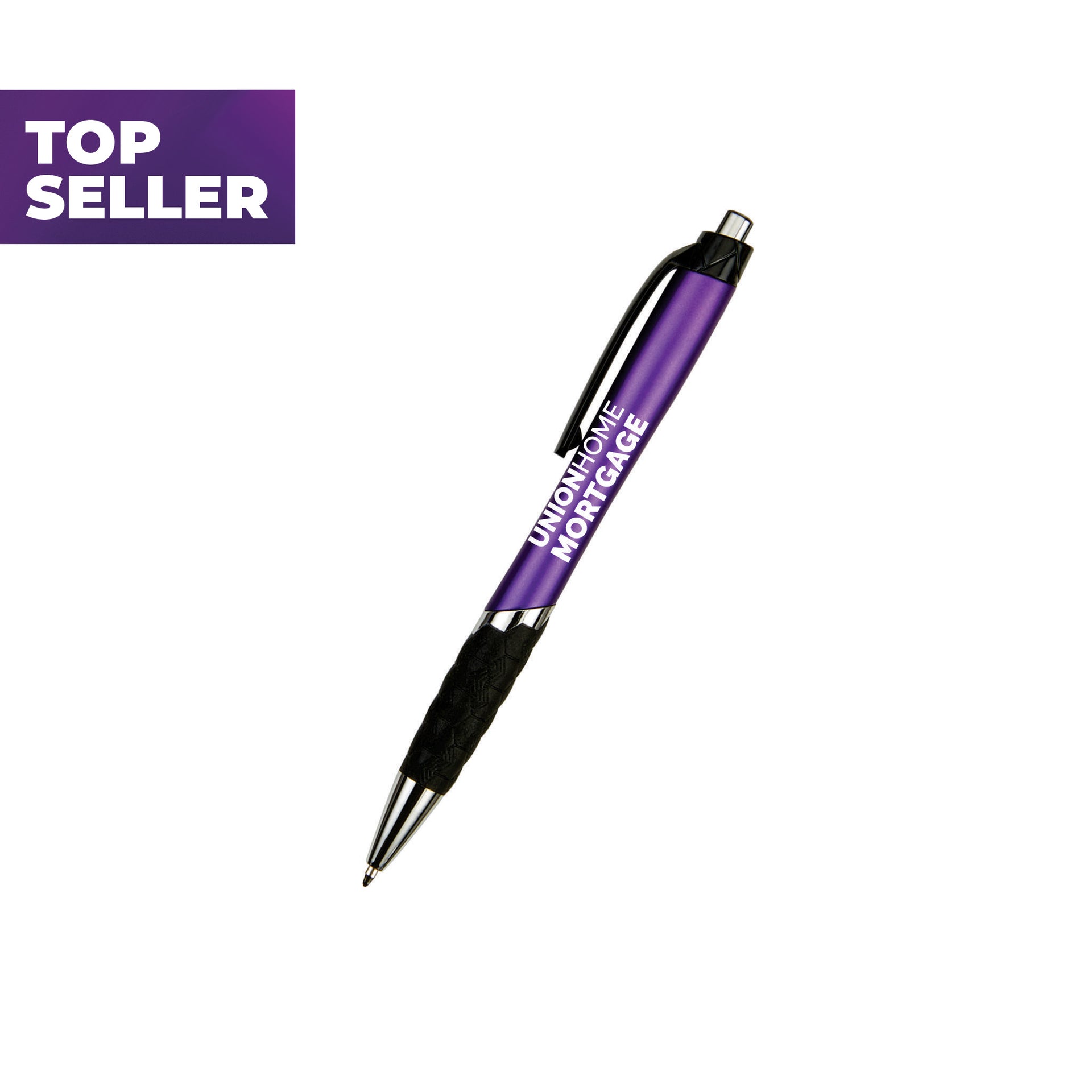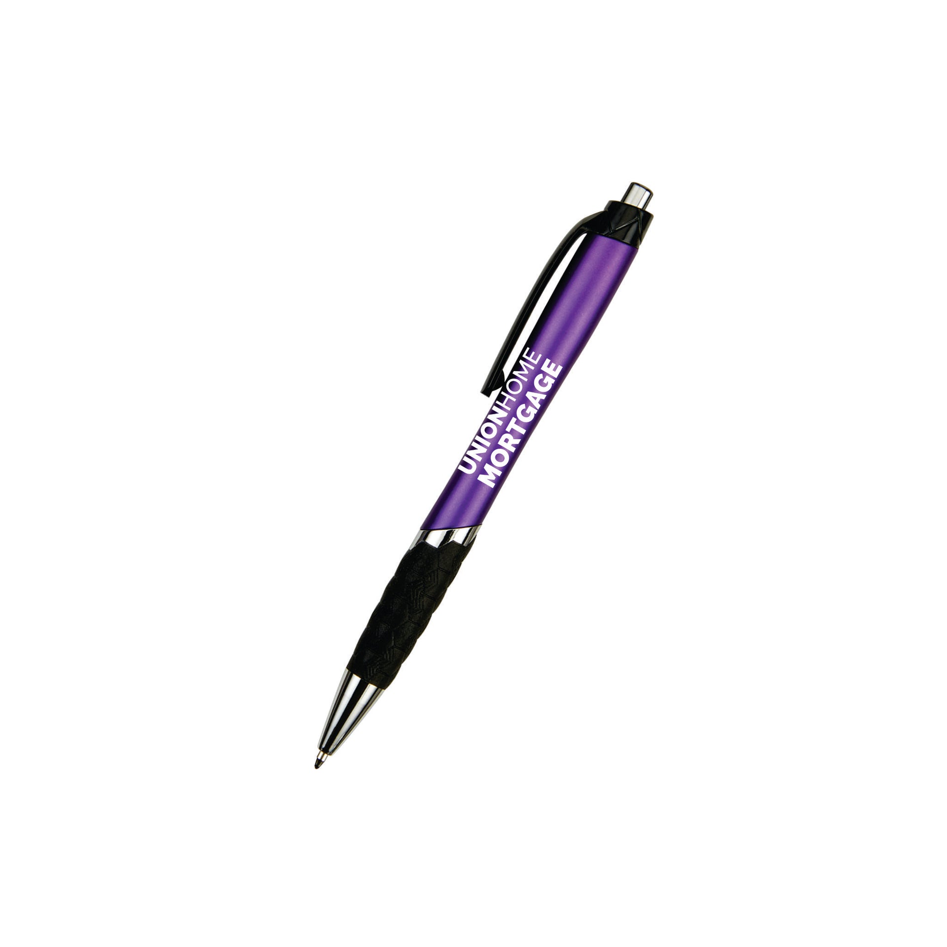 Pens are great giveaways for any event and having the Union Home Mortgage logo on them is even better. This retractable ballpoint pen features a metallic colored barrel, a black plastic clip with black geometric pattern rubber grip, chrome ferrule and plunger and black medium point Glide-Write ink.